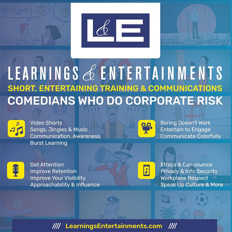 Being positive, preventative and proactive is a more efficient and effective way to mitigate risk. A regular drumbeat of short, entertaining communications and nudge-learning helps improve engagement, awareness and stickiness of learning. Life is easier when the business enjoys hearing from you. Entertainment helps!